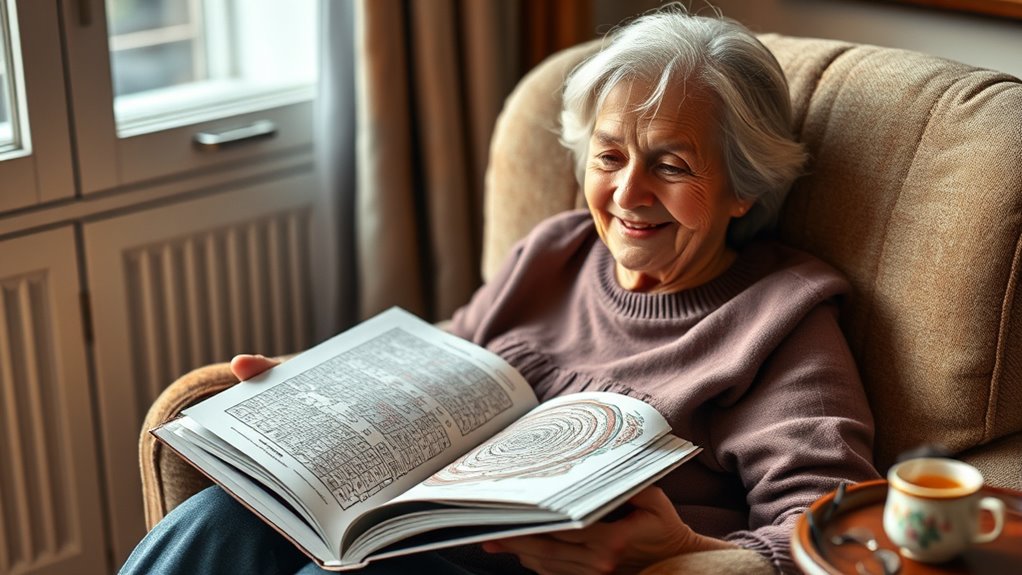 Selecting puzzles that match a senior’s cognitive abilities guarantees they stay engaged without feeling overwhelmed. Puzzle books often categorize puzzles into beginner, intermediate, and advanced levels, making it easy to find suitable challenges. This progression helps seniors build confidence while avoiding frustration. Adjustable difficulty options, like larger print puzzles for visual impairments, further accommodate individual needs. Including a mix of easy and more complex puzzles keeps the experience fresh and prevents boredom or feelings of inadequacy. Clear instructions and hints are essential, especially for higher-difficulty puzzles, as they support independence and boost confidence. By carefully choosing puzzles that align with their abilities, seniors can enjoy a stimulating experience that’s both enjoyable and manageable.