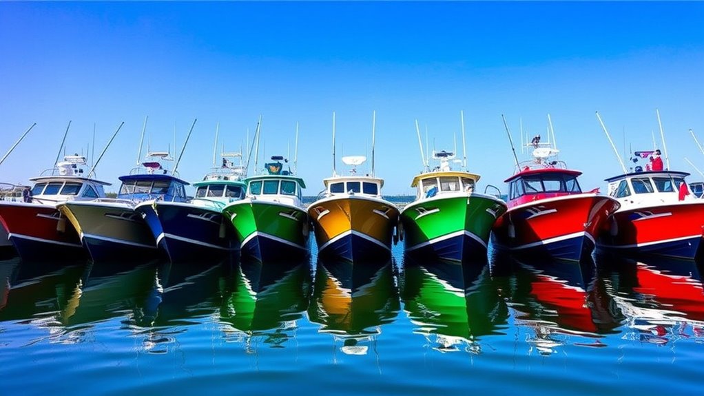 Safety features are vital in modern bait delivery boats. I always look for sturdy, non-slip decks to prevent falls, and reliable navigation systems like GPS and radar to avoid hazards. Automatic bilge pumps are necessary for handling water ingress, while life jackets and emergency communication devices guarantee safety in case of trouble. These features give me peace of mind, knowing I can focus on fishing without compromising safety.