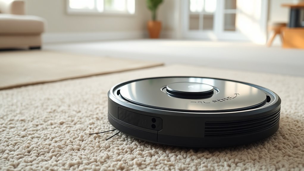 Since pet owners want to minimize allergens in their homes, prioritizing allergen filtration quality is essential when selecting a robot vacuum. Look for models equipped with HEPA filters or equivalent high-efficiency systems that trap at least 99.97% of particles as small as 0.3 microns, including pet dander, dust mites, and other allergens. Multi-layer filtration, combining pre-filters and HEPA filters, offers superior allergen removal. Additionally, tangle-free brushrolls and anti-hair wrap tech prevent pet hair from escaping or accumulating, enhancing containment. Sealed filtration chambers and airtight dust bins are critical to prevent allergen escape during disposal. Remember, regular filter cleaning or replacement is crucial for maintaining peak filtration performance, ensuring your home stays cleaner and healthier for everyone.