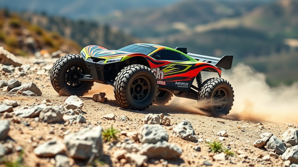 Choosing the right materials for your RC car’s frame and components makes all the difference when tackling tough off-road terrains. Reinforced plastic, metal, and impact-resistant chassis provide the strength needed to withstand collisions and rough surfaces. High-quality shock absorbers made from metal or oil-filled components help absorb impacts from jumps and bumps, protecting internal parts. Waterproof electronic components and sealed casings prevent damage from mud, water, and dust, ensuring your RC car keeps running smoothly. Impact-resistant tires crafted from reinforced rubber or foam offer durability and traction on uneven, rocky, and muddy tracks. Additionally, a strong frame with reinforced joints and shock mounts boosts resilience during intense racing. These durable materials are essential for maintaining performance and longevity in challenging off-road conditions.