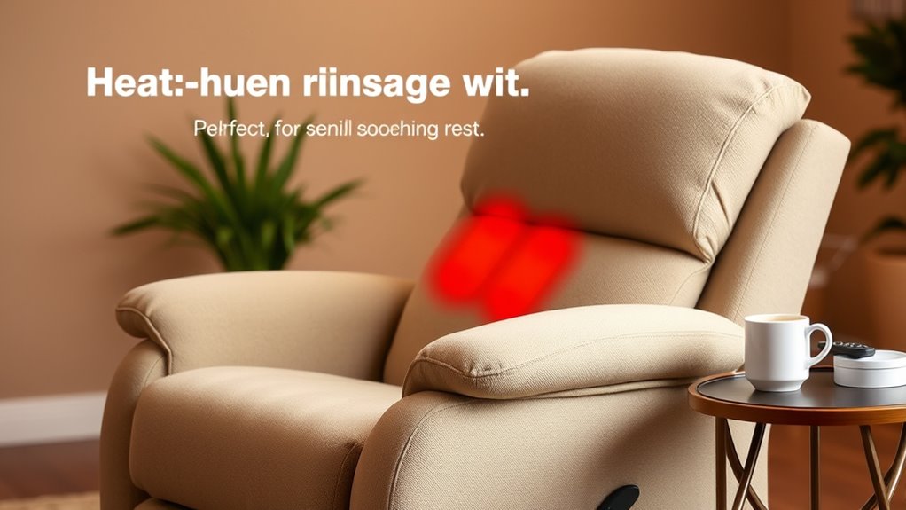 Selecting the right heat and massage features can greatly enhance a recliner’s therapeutic benefits for seniors. I recommend choosing models with multiple massage zones like the back, lumbar, thighs, and legs, for targeted relief. Adjustable massage modes and intensity levels allow customization to suit individual needs, providing maximum comfort. Lumbar heating is especially beneficial for promoting blood circulation and relaxing tight muscles. It’s important that the heat and massage functions can operate independently, giving flexibility and safety, especially with timer options. Investing in recliners with high-quality vibration motors and heating elements ensures consistent, soothing warmth and effective massage performance. These features not only elevate comfort but also contribute notably to overall relaxation and muscle recovery for seniors.
