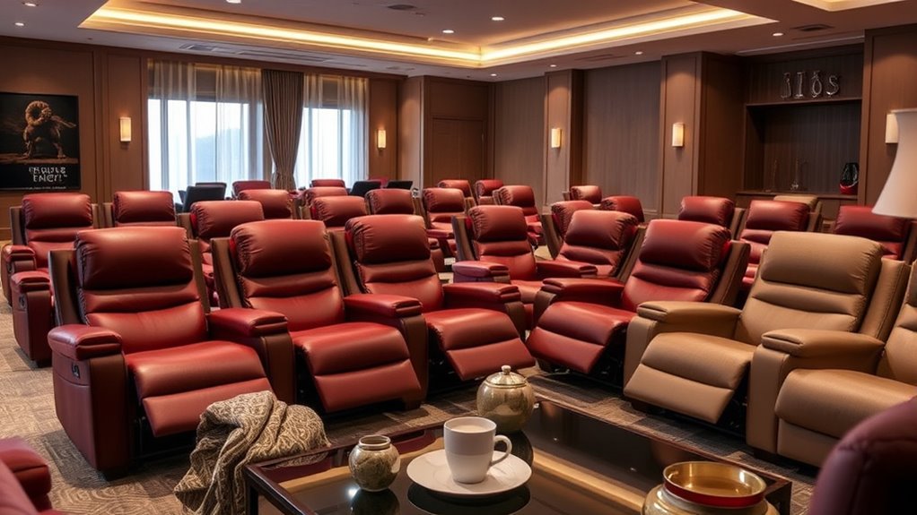 While I’m on the hunt for a reclining sofa with power headrests, I quickly realize that material quality and durability are crucial factors to take into account. I focus on high-quality options like top grain leather or heavy-duty fabrics that resist wear and tear. Sturdy frames made from reinforced hardwood or metal are essential for lasting strength. I also check for fabrics certified by OEKO-TEX Standard 100 or CertiPUR-US, which ensure safety and scratch resistance. Reliable cushioning with dense foam or memory foam is a must to avoid sagging over time. Ultimately, I pay attention to the power components; UL-certified motors promise smooth operation and durability, ensuring my sofa remains functional for years to come.