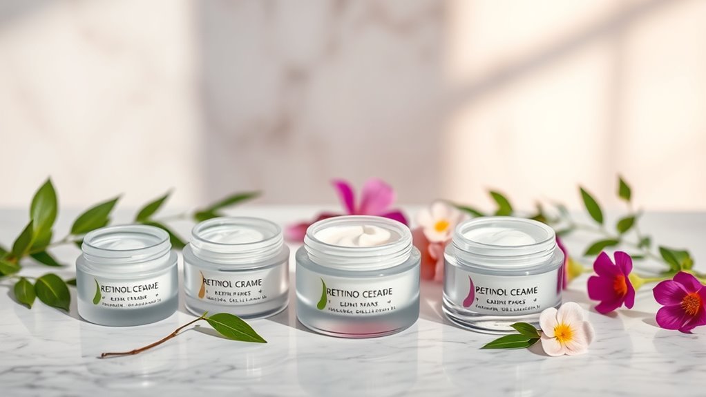 Choosing the right retinol cream can be a game-changer for your anti-aging routine, especially since skin types vary considerably in their needs. If you have sensitive skin, look for lower concentrations, like 0.1% to 0.3%, to minimize irritation. Oily or acne-prone skin can handle stronger formulas, often up to 1% or more, to help manage oiliness and breakouts. For dry or mature skin, prioritize hydrating formulations with ingredients like hyaluronic acid or ceramides to combat dryness. Always opt for fragrance-free and non-comedogenic products if you’re prone to reactions. Ultimately, I recommend testing a small patch first to see how your skin reacts before committing to full application. Your skin’s unique needs should guide your choice!