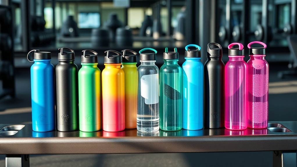 Looking for the best reusable water bottles that keep me hydrated and stylish at the gym? I prefer bottles with leak-proof lids, easy one-handed operation, and durable, eco-friendly materials like Tritan or stainless steel. Size matters too, so I pick options with wide mouths and comfortable grips. Whether it’s a bottle with time markers, magnetic caps, or impact resistance, I find the perfect match. Stick around to discover more top picks that fit every active lifestyle.