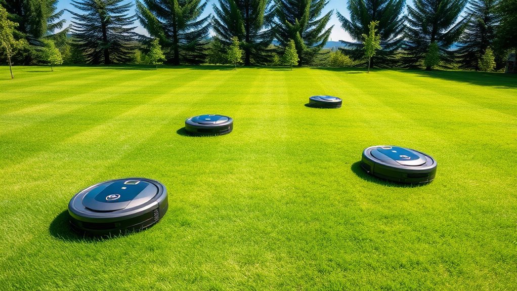 Effective obstacle detection is crucial for ensuring that your robot lawn mower can safely navigate large, complex yards. Modern models use advanced sensors like LiDAR, ToF cameras, and ultrasonic sensors to identify over 150 to 300 obstacle types, from garden furniture to pets. AI-powered systems enhance this capability by recognizing objects such as trees and toys, preventing collisions and damage. Many mowers feature real-time obstacle detection, allowing for quick path adjustments that minimize missed spots and ensure thorough coverage. Combining sensors with AI algorithms boosts recognition accuracy, even in challenging lighting or uneven terrain. This technology not only protects your lawn and mower but also provides peace of mind, knowing that your mower can handle obstacles confidently and safely during every mow.