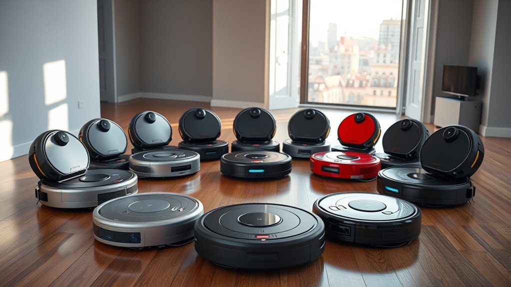 Robot vacuums come in a wide range of prices, from budget models around $150 to premium units over $1,000, so it’s important to weigh what you get for your money. Higher-priced models typically offer advanced navigation, longer battery life, self-emptying stations, and sometimes mopping functions, providing better value for extensive cleaning. Comparing the cost against features like suction power, coverage, and smart home compatibility helps determine if a more expensive vacuum is worth the investment. Keep in mind that budget models may lack durability or smart sensors, which could lead to higher long-term costs for repairs or replacements. Reading customer reviews and checking warranty coverage can further guarantee you’re getting the best value for your money.