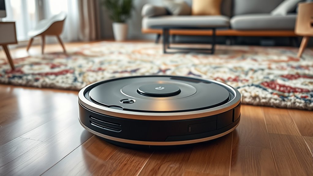 Have you considered whether a robot vacuum’s suction power and brushes match your specific floors? It’s essential to select a model suited to your surfaces, whether hard floors, carpets, or rugs. Some vacuums offer adjustable suction levels or modes, helping prevent damage and ensuring effective cleaning across different surfaces. Be sure to verify if the vacuum is compatible with low-, medium-, or high-pile carpets, as some are better suited for hard floors only. Additionally, consider the device’s height and navigation to ensure it can reach under furniture and into tight spaces. Look for features like carpet boost or multi-surface cleaning modes, which enhance performance on varied floor types. Matching your vacuum’s capabilities with your floor types guarantees thorough cleaning without compromising your floors’ integrity.