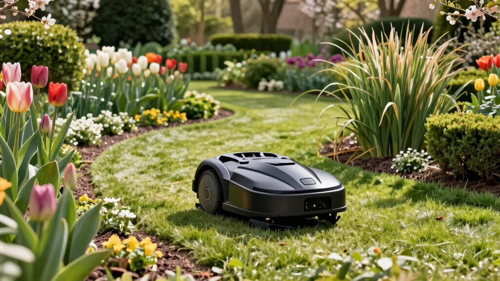 Did you know that over 80% of robotic mowers now come with obstacle detection? I’ve found that most of these mowers can navigate around garden obstacles automatically, thanks to advanced sensors and AI. They detect objects like trees, flower beds, and furniture, stopping or rerouting as needed. It’s impressive how smoothly they work, making yard maintenance effortless and saving me time and effort.