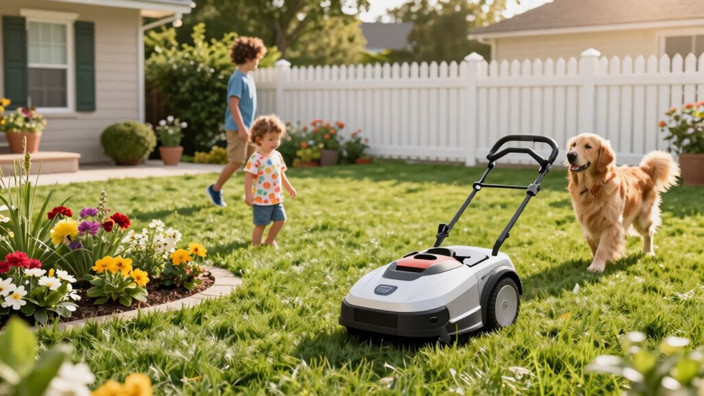 Are safety features truly essential when choosing a robotic lawn mower for a home with kids and pets? Absolutely. These features, like obstacle detection and collision avoidance, help prevent accidents during mowing. Automatic shut-off systems activate if the mower detects children or pets nearby, reducing risks. Safety bumpers and vision-based obstacle recognition allow the mower to stop immediately upon contact or detection of movement, keeping everyone safe. Quiet operation is also vital, as it minimizes noise disturbance and reduces startling children and pets. Additionally, security features like PIN codes and alarms prevent unauthorized use, ensuring the mower stays safe around curious little ones and playful pets. Prioritizing these safety features provides peace of mind and makes outdoor spaces safer for everyone.
