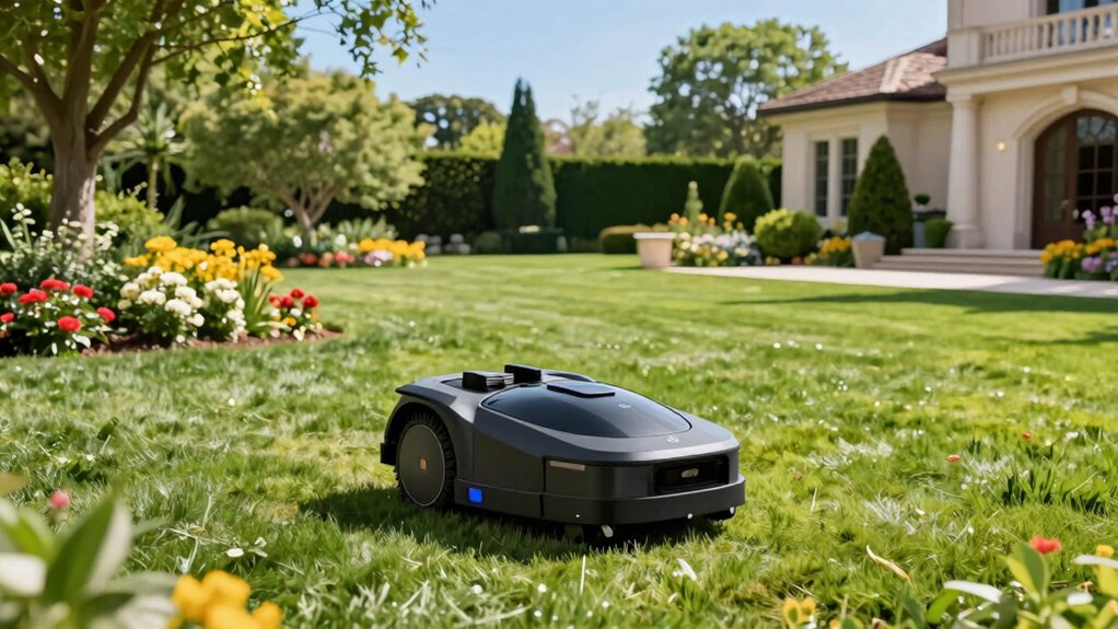 When selecting a robotic mower for large yards, safety and obstacle detection features are essential to guarantee reliable and worry-free operation. Advanced obstacle detection systems can recognize over 1,000 object types, helping the mower navigate safely around pets, furniture, and yard hazards. Cameras with a 300° field of view, combined with AI algorithms, enable superior obstacle avoidance and real-time hazard recognition. Multi-zone management with no-go zones allows precise exclusion of sensitive areas like pools and flower beds. Ultrasonic radars and 3D sensors detect objects as small as 1 cm wide and 5.9 inches high, preventing collisions. These technologies markedly reduce the risk of damage and ensure safe operation, even in complex or cluttered large yards. Safety features like these provide peace of mind during mowing sessions.