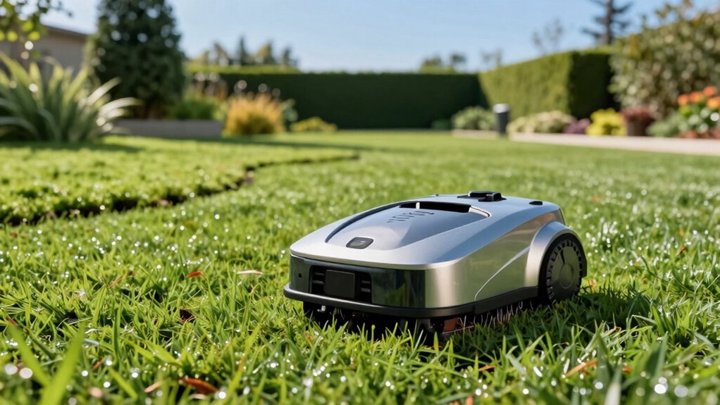 Imagine your fresh sod basking in the sun, perfectly trimmed and lush, thanks to a trusty robotic mower. With the right choice, you’ll enjoy a pristine lawn without lifting a finger—just watch your yard transform into a green masterpiece. Whether it’s obstacle avoidance or app control, these top models make lawn care effortless. So, pick one, set it loose, and let your new sod thrive under the gentle hum of innovation.