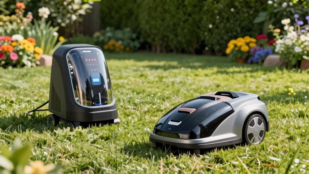 Choosing the right robotic lawn mower is like planting a seed that grows into a lush, effortless yard. I remember setting mine up on a rainy day, worried about weatherproofing, only to find it thriving, just like my garden’s resilience. With the right features and weatherproof charging stations, your mower can conquer any weather, making yard work feel more like a breeze than a chore. Trust me, investing in quality now pays off in a beautifully maintained lawn year-round.