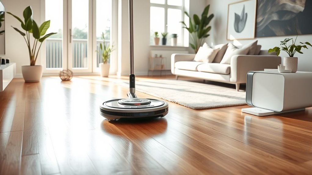 Smart features in robotic mops can substantially enhance your cleaning experience, making it easier to manage your home. I love how app control and voice command compatibility allow me to operate my mop remotely. With advanced sensors and obstacle avoidance technology, I don’t have to worry about missed spots or re-cleaning. Multi-floor mapping and the ability to set virtual boundaries through the app ensure my mop cleans exactly where I want it to—no manual intervention needed. Plus, real-time monitoring keeps me updated on cleaning progress, filter status, and water levels. I appreciate that my robotic mop integrates seamlessly with smart home systems like Alexa and Google Assistant, making voice-activated commands a breeze. These smart features truly transform my cleaning routine!