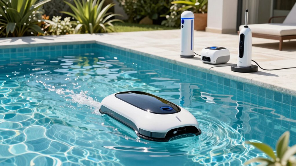 I recommend servicing your robotic cleaner every 1 to 3 months, depending on how often you use your saltwater pool and the level of debris. Regular inspection helps guarantee peak performance, especially in maintaining the brushes and filters. If you notice it’s not cleaning as efficiently or if there’s buildup, I suggest servicing sooner. Consistent maintenance keeps your cleaner running smoothly and extends its lifespan.