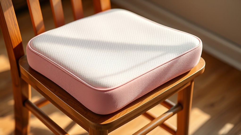 Choosing the right seat cushion for elderly individuals hinges on finding a balance between firm support and soft comfort. I recommend cushions that offer gentle yet sturdy support to reduce pressure on sensitive areas like the tailbone and hips. Look for ergonomic contours and beveled edges, which promote good posture and help prevent discomfort during long periods of sitting. Support should be be adaptable or mold to the body’s shape for personalized comfort and effective pressure distribution. Memory foam or gel-infused materials are ideal because they conform to body curves while maintaining support over time. Also, non-slip features and stable covers are vital to keep the cushion securely in place, providing consistent support, especially for those with limited mobility.