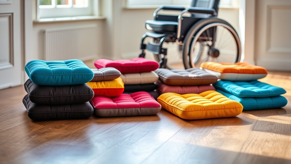 Choosing the right cushion material is essential for ensuring both comfort and durability in wheelchair seat cushions. I always look for high-quality options like memory foam or gel, as they provide excellent pressure distribution and lasting support. Durable materials, such as reinforced PVC or heavy-duty fabric, can withstand frequent use and resist tearing. Breathable fabrics like mesh or ice silk are vital too; they enhance airflow, reducing heat buildup during long periods of sitting. I also prefer cushions with foam or gel cores that maintain their shape over time, ensuring consistent pressure relief. Lastly, waterproof and easy-to-clean covers are non-negotiable for hygiene, especially in environments where spills or moisture are common.