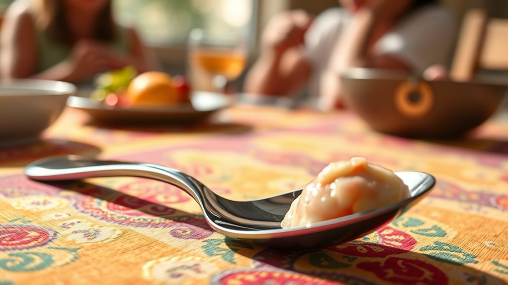 When it comes to adaptive spoons, think of them as the trusty steed in a knight’s quest for independence. I’ve found that stainless steel and silicone are the best materials for durability and safety. Stainless steel resists rust and withstands wear, while silicone provides a comfortable grip and is gentle on the mouth. Both materials guarantee that eating is a smooth journey, allowing me to enjoy meals without worry.