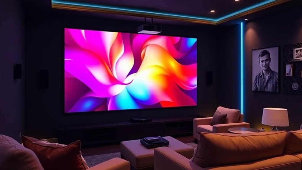 If you’re looking for the best short-throw projectors under $1000 for a home theater, I’ve found top models that offer high-resolution images, bright visuals, and smart features like WiFi, Bluetooth, and built-in apps. Many support 4K or 1080p with auto-focus, keystone correction, and portable designs, perfect for indoor or outdoor use. These projectors combine excellent picture quality with easy setup, all within your budget. Keep exploring to discover more options that fit your needs.