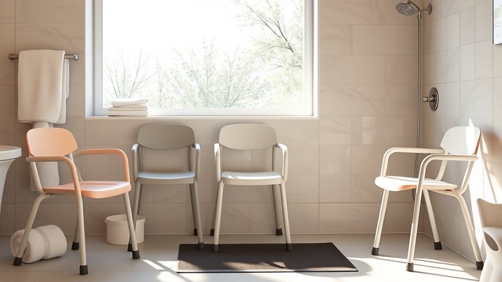 While selecting a shower chair for elderly users, prioritizing safety features is crucial for ensuring a secure bathing experience. I always look for slip-resistant feet, as they considerably reduce the risk of slips and falls. Padded armrests and backrests are essential too; they offer extra support and stability, making the shower safer. Adjustable height settings are another must-have, ensuring a snug fit that prevents instability. I also appreciate chairs with drain holes in the seat, which help eliminate water pooling and minimize slipping hazards. Finally, reinforced frames and a high weight capacity enhance overall safety, especially for users with higher body weights. These features combine to create a safer, more comfortable bathing environment.