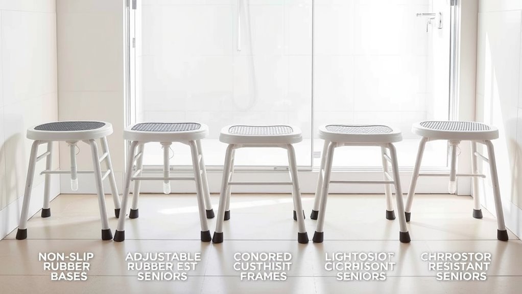 When selecting a shower stool for seniors, I focus on safety features like non-slip feet and sturdy construction. I also consider adjustable height options to guarantee comfort and proper support, along with weight capacity and durable materials for long-term use. Ease of assembly is vital too, so I look for stools that are simple to set up and maintain.