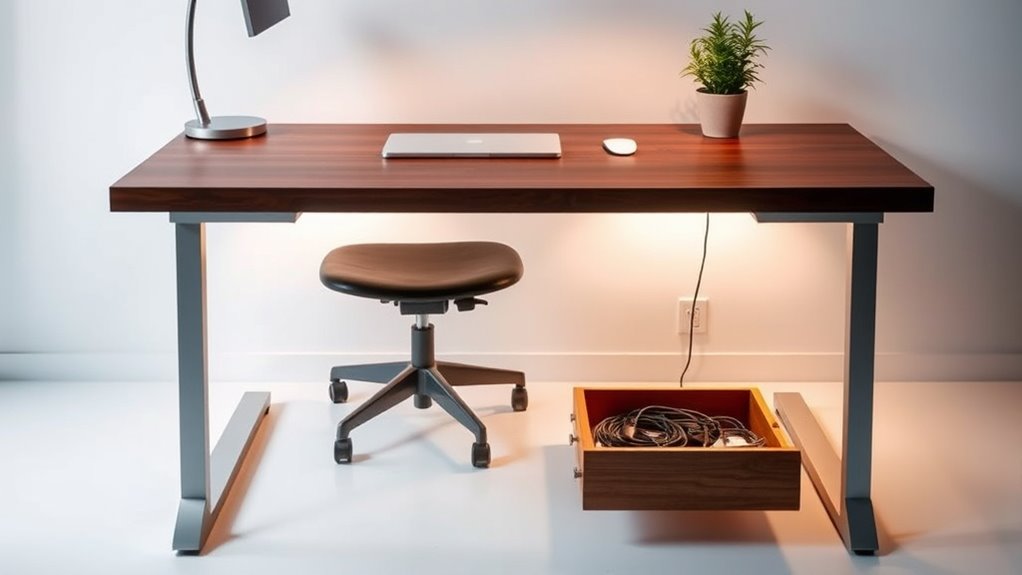 If you’re searching for the best sit-stand desks with cable management drawers, I’ve got you covered. These desks not only provide adjustable heights for better posture but also feature innovative storage solutions to keep your workspace organized and clutter-free. From stylish designs to sturdy constructions, there’s something for everyone. Plus, with seamless cable management, you’ll love how tidy everything looks. Keep exploring to find the perfect desk that fits your needs and boosts your productivity!