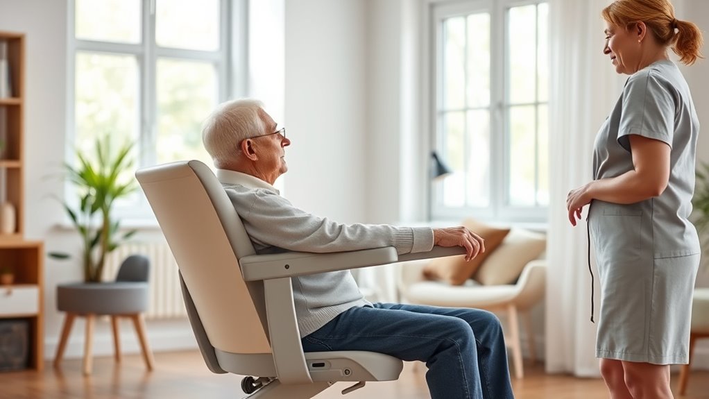 Think of operating a sit-to-stand lift like steering a ship; proper training keeps everything on course. I’ve found that training should cover device operation, safety protocols, and emergency procedures. Most importantly, I learned how to assess each user’s needs and adjust the lift accordingly. Hands-on practice under expert supervision guarantees I can operate it confidently and safely, making sure my loved ones are protected and comfortable.