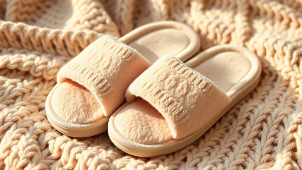 I recommend replacing slippers every six to twelve months to guarantee they provide ideal support and safety. Over time, soles wear down, cushioning diminishes, and slips become more likely. I stay vigilant for signs like flattened tread, loss of comfort, or visible wear and tear. If your slippers no longer feel supportive or slip more often, it’s time for a new pair to keep you secure and comfortable.