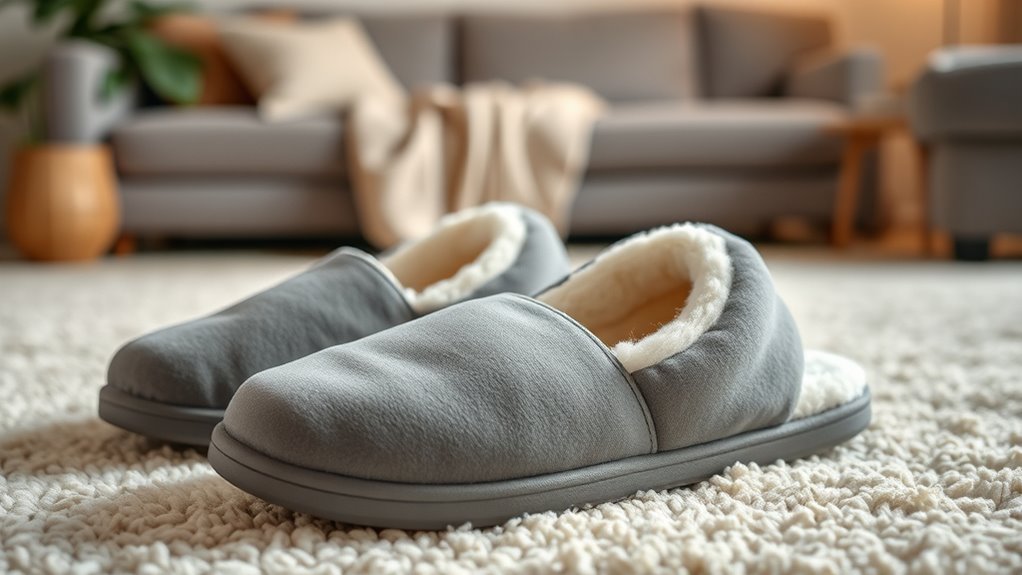 When selecting slippers with memory foam, slip resistance becomes a key factor for safety and confidence during wear. I look for slippers with textured rubber soles that provide better traction on smooth or wet surfaces, which helps prevent falls. Many slip-resistant slippers are tested and rated to meet specific safety standards, giving me peace of mind whether I’m indoors or outdoors. Non-slip soles are especially important on polished floors, tiles, or in areas prone to spills or moisture. Proper slip resistance not only protects me from accidents but is also vital for anyone with mobility issues or when wearing socks. Choosing slippers with good slip-resistant soles ensures safety without sacrificing comfort or style, making them a smart choice for everyday use.