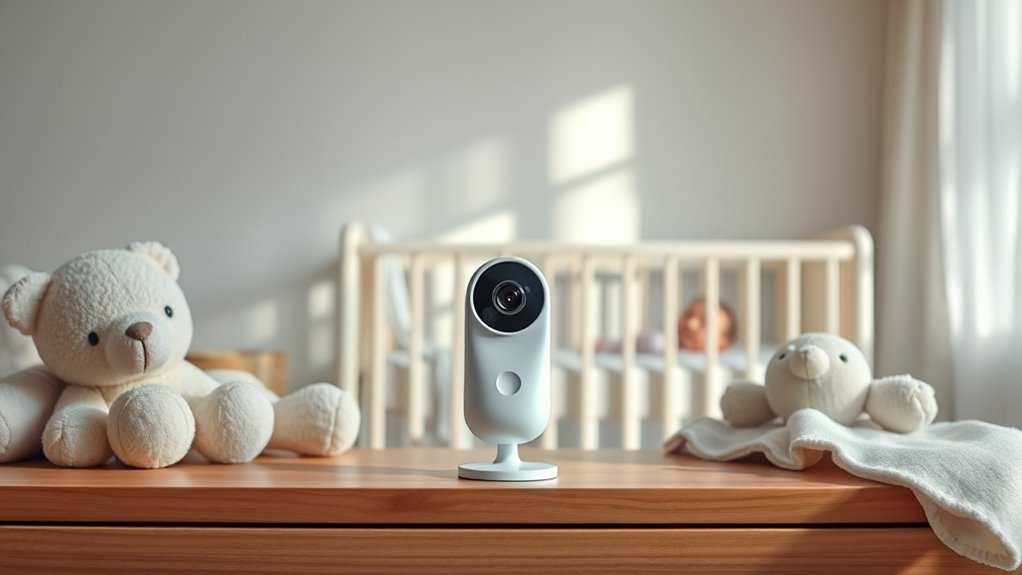 Choosing a smart baby monitor with a camera means paying close attention to video quality and resolution. I’ve found that higher resolution cameras, like 1080p or 2K, provide clearer, more detailed footage, making it easier to see my baby’s movements and expressions. Also, digital zoom capabilities let me focus on specific areas without losing image quality, which is vital for close-up observations. The frame rate matters too; I prefer monitors with at least 30 fps for smooth video, reducing any lag or motion blur. Ultimately, high-quality video directly impacts my ability to quickly identify safety issues or signs of distress, making this feature essential for effective monitoring.
