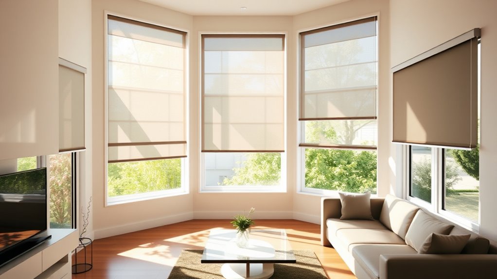 Solar-powered options eliminate reliance on external power sources, making them an eco-friendly choice that lowers energy consumption. Using high-quality blackout or thermal fabrics further enhances insulation, minimizing heat transfer. Plus, when integrated with smart home systems, you can control them remotely, ensuring they operate efficiently according to real-time weather conditions. It’s a smart investment for your home!