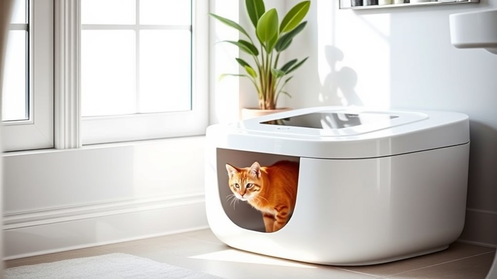 If you’re tired of manual scooping, smart cat litter boxes are a game changer. They automate cleanup, save time, and often come with app controls for health monitoring and alerts. Many models accommodate multiple cats and include advanced safety features, such as sensors to prevent accidents. Plus, they offer excellent odor control. Want to find the best options and factors to contemplate for your needs? I’ve got you covered with that information!