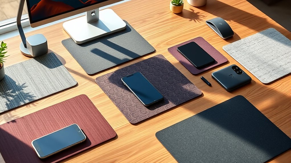 I find that maintenance is a breeze; a damp cloth or mild soap usually does the trick, especially since many mats are spill-proof and stain-resistant. Regular cleaning not only keeps the mat looking fresh but also guarantees maximum wireless charging and mouse control. Choosing a sturdy, easy-to-clean mat guarantees long-term usability without the worry of fraying or fading.