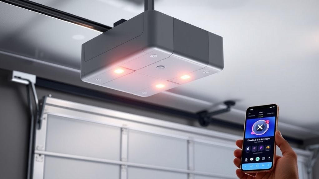 Smart connectivity features transform a basic garage door opener into a powerful home security tool. They let me control, monitor, and manage my garage door remotely through smartphone apps, adding convenience and peace of mind. Many openers support voice commands via Alexa, Google Assistant, or Apple Watch, making operation hands-free and quick. Advanced Wi-Fi or Bluetooth technology guarantees seamless setup and reliable connectivity with my smart devices. Real-time alerts and activity logs keep me informed about door status and usage, enhancing security. Additionally, some models integrate with other smart home systems or delivery services like Amazon Key, expanding their functionality. When choosing a smart garage door opener, I prioritize these features to ensure I stay connected, secure, and in control at all times.