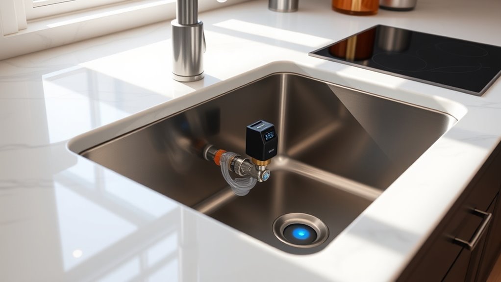 Did you know that nearly 1 in 50 homes experiences water damage annually? I start by turning off the main water supply, then locate the main water line where I’ll install the sensor. I follow the manufacturer’s instructions, typically attaching the sensor with screws or adhesive, and connect it to my Wi-Fi. Finally, I test the system to verify it detects leaks properly. It’s simple and gives me peace of mind.