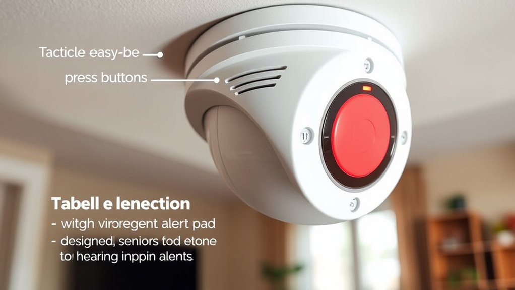 Choosing the right visual alarm indicators is vital for guaranteeing seniors with hearing loss can respond quickly during emergencies. Bright, high-contrast LED lights are essential for catching attention, especially in bedrooms or quiet areas where sound may not be effective. The placement of these visual alerts matters greatly—they should be positioned so they are visible from all parts of a room or home. Some smoke detectors combine visual alarms with other alert systems, like vibrating pads or flashing lights, to enhance safety. Regulations often require that smoke alarms for hearing-impaired individuals include visual indicators as a standard feature. By selecting detectors with effective, well-placed visual alarms, you can guarantee seniors are promptly alerted and can take swift action during emergencies.