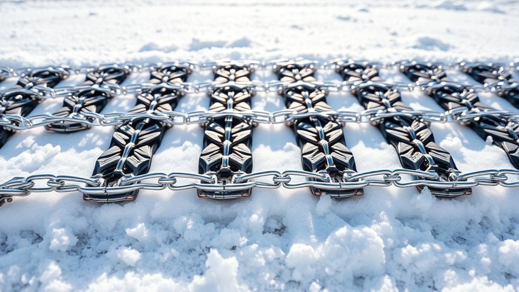 Traction performance is essential for safe driving on snow and ice, and the right features can make all the difference. I look for snow chains with diamond pattern cross links, as they provide better grip and a smoother ride. The material matters too; reinforced alloy steel or manganese alloy steel enhances durability and traction stability. The design, especially the shape and width of the cross links, directly affects slip prevention and grip. Features like auto-tightening ratchets or built-in tensioners help maintain consistent tension, ensuring ideal traction throughout. Additionally, traction coils or anti-slip particles on the surface increase ground friction, which shortens braking distances in winter conditions. These features work together to keep you safer and more confident on icy roads.