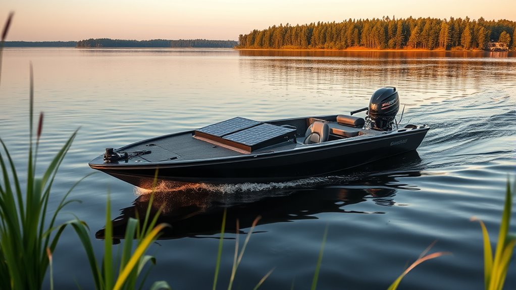Looking to boost your fishing game with reliable solar power? I recommend checking out top kits like the Voltset 20W with MPPT, SUNER POWER waterproof chargers, and the impressive Topsolar 100W panel. These setups offer high efficiency, waterproofing, and compatibility with various batteries, ensuring long-lasting, eco-friendly energy on the water. Keep in mind key factors like power output and weather resistance. Stay with me if you want to uncover more about these excellent solar bait boat kits.