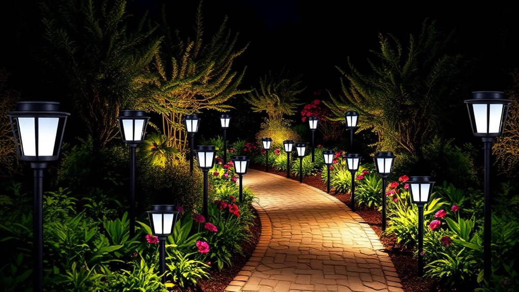 The power source of your solar landscape lights with motion sensors plays a crucial role in their performance and reliability. These lights depend on photovoltaic panels that convert sunlight into electricity, eliminating the need for external wiring. They usually have rechargeable batteries that store energy during the day for nighttime use, with capacity influencing how long they stay lit. The efficiency of the solar panel, typically between 22% and 30%, affects how quickly they charge. Proper placement in direct, unobstructed sunlight is essential for ideal performance. Some models offer dual power sources, like solar panels combined with USB charging, ensuring continuous operation even during cloudy days or low sunlight. Choosing the right power source ensures your lights stay bright and dependable.