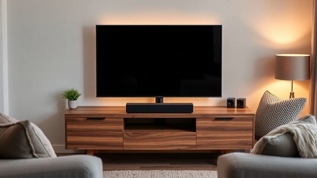 Think of your soundbar as the heart of your room’s audio harmony. Placement is essential—if it’s tucked away or blocked, it’s like trying to hear through a wall. I always recommend positioning it at ear level, directly facing your seating area, to let the sound flow freely. Proper placement guarantees every note resonates clearly, turning your small space into a rich, immersive sound sanctuary.