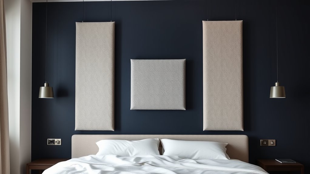 Selecting soundproofing panels that blend seamlessly with your bedroom decor can make a significant difference in creating a calm, inviting space. When choosing panels, pick colors and designs that match or complement your existing style for a cohesive look. Decorative shapes like wedges or wave patterns can add visual interest while enhancing acoustics. Pay attention to the finish and material to guarantee they suit your interior, whether modern, minimalist, or traditional. Opting for panels with customizable arrangements or multiple color options allows you to integrate them effortlessly into your decor. Striking a balance between soundproofing effectiveness and visual harmony is key—choose panels that serve both functional and decorative purposes to maintain a stylish, peaceful bedroom sanctuary.
