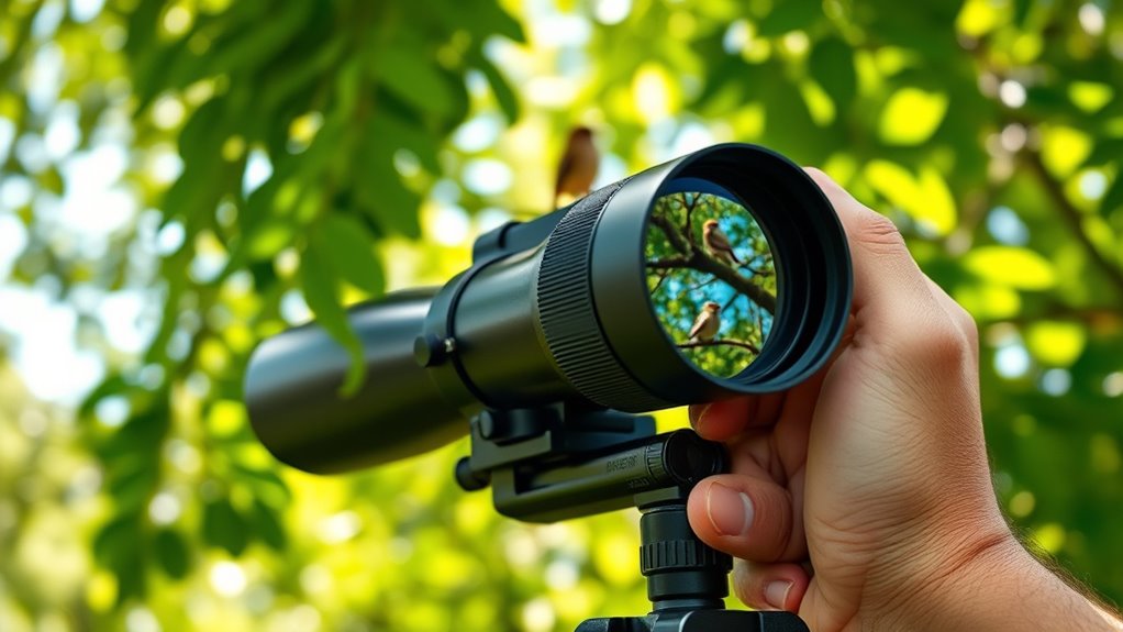 Choosing the right spotting scope feels like finding a hidden gem—sometimes, the perfect match appears unexpectedly. As I’ve discovered, considering factors like magnification, waterproofing, and portability can make all the difference. Whether it’s a chance encounter with a vivid bird or a quiet moment in nature, your ideal scope becomes a trusted companion. Ultimately, the best choice aligns with your passion, turning everyday birdwatching into a serendipitous adventure.