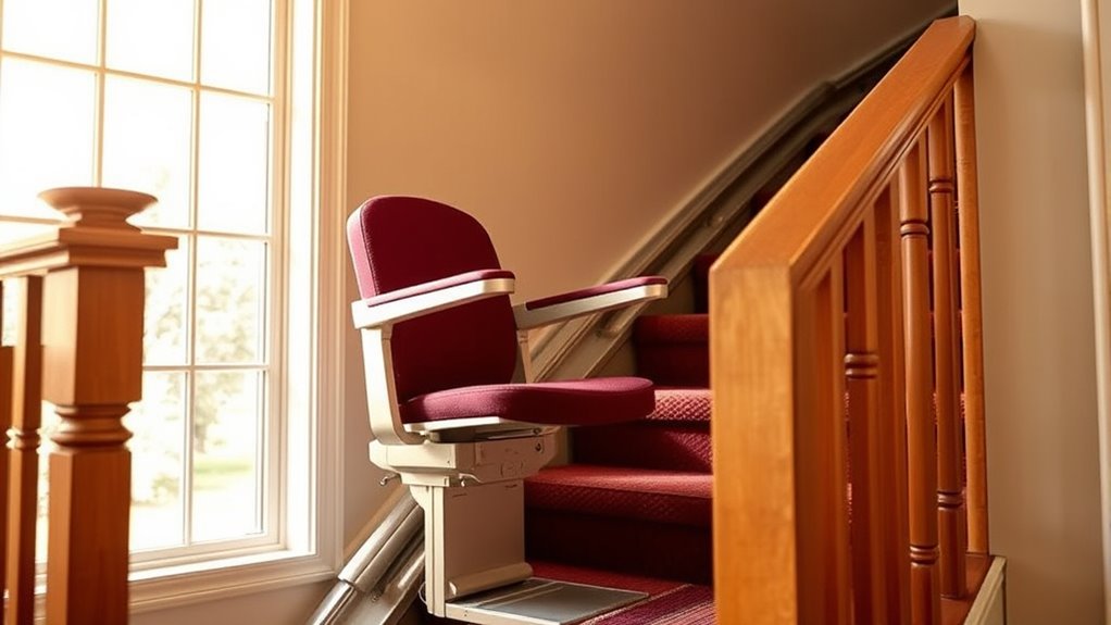 Imagine a sturdy seatbelt gently securing you as the stair lift moves smoothly. Essential safety features include seatbelts, obstacle sensors that halt the ride if something’s in the way, and sturdy armrests for stability. I always look for easy-to-use controls and reliable emergency stop buttons. These features act like a safety net, giving seniors confidence and peace of mind every time they ascend or descend their stairs.