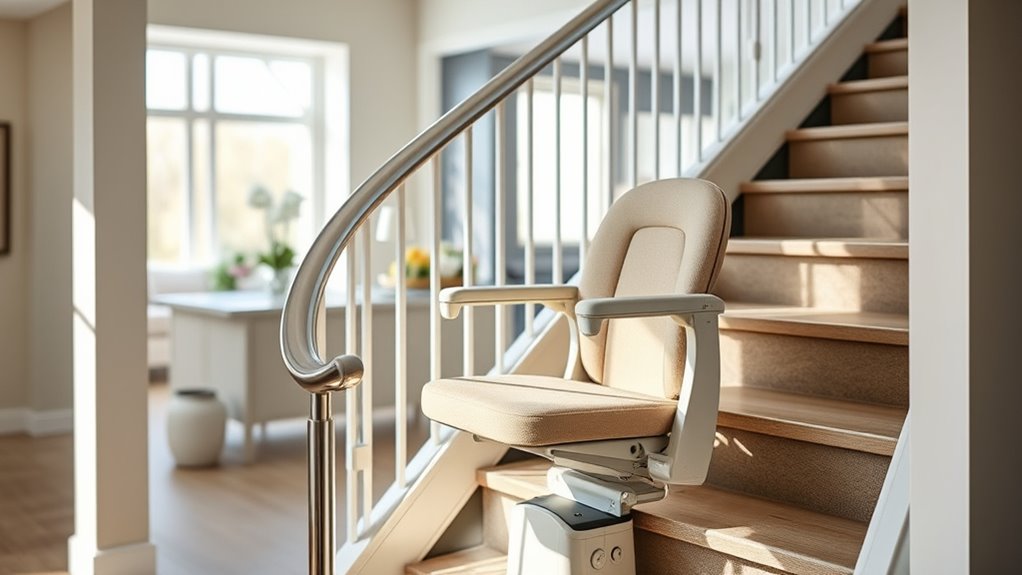 To select the appropriate stairlift for your staircase, I recommend measuring your stairs carefully and considering the type—straight or curved. Think about your space, weight capacity, and any special needs like seat height or additional safety features. I also suggest consulting with a professional to guarantee proper fit and installation. This way, you’ll find a stairlift that’s comfortable, safe, and tailored to your home’s unique layout.