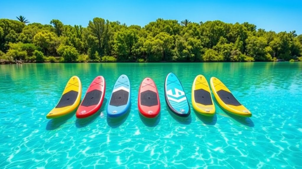 Choosing the right board size is essential for beginners because it directly affects your stability on the water. An 11-foot or longer board offers a wider base, making it easier to stay balanced. Wide boards, usually 30 inches or more, distribute your weight evenly, boosting stability. Thicker boards, around 6 inches or more, increase buoyancy and reduce wobbling, helping you feel more secure. The board’s volume, measured in liters, also matters—over 150 liters provides extra stability for newcomers. Additionally, a flat, wide shape and features like a non-slip deck pad improve grip and balance while paddling. Overall, larger, wider, and thicker boards are better suited for beginners because they make learning easier and help build confidence on the water.
