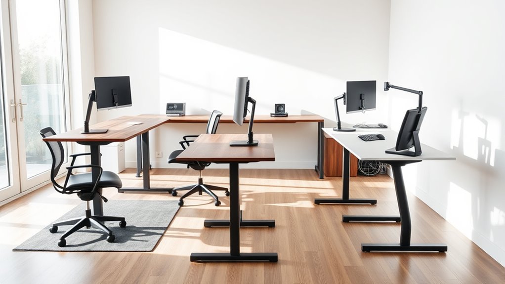 Looking for the best standing desks of 2026 that boost comfort and productivity? I recommend options with spacious surfaces, sturdy frames, and easy electric height adjustments from around 28” to over 48”. Features like built-in cable management, multiple presets, and ergonomic designs enhance your workspace. Whether you prefer corner setups or simple converter models, there’s something for every need. Keep exploring to find the perfect fit that keeps your work comfortable and efficient.