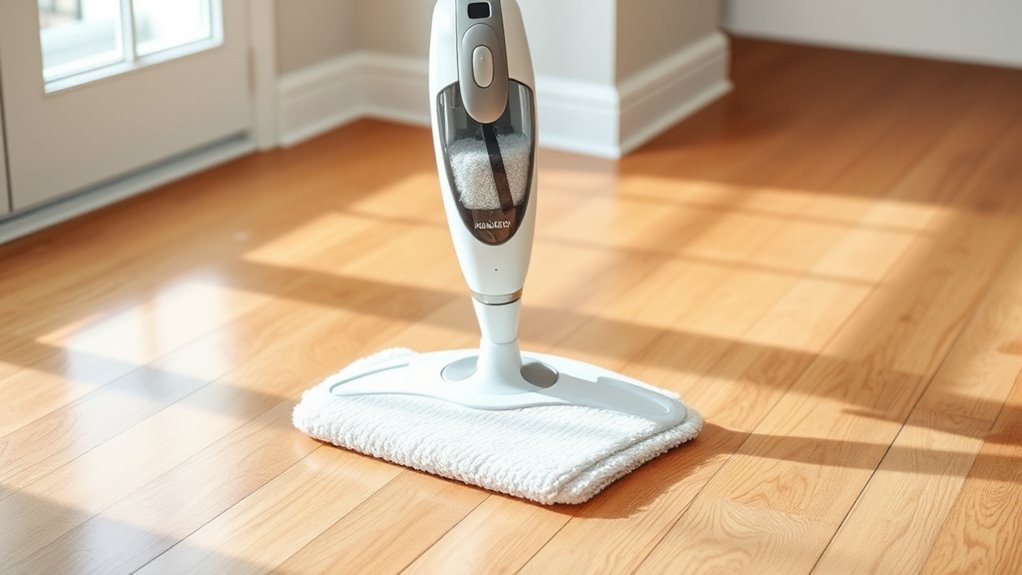 Have you considered whether a steam mop is compatible with your specific flooring? It’s vital to check if the mop works safely on your surfaces, like hardwood, tile, laminate, or vinyl. Some floors, especially unsealed ones, can be damaged by excess water or moisture, so verify your mop is safe for sealed surfaces. Look for models that produce the right amount of steam for delicate floors—too much moisture can cause swelling or discoloration. Additionally, verify that the cleaning pads and attachments are suitable for your floor type to maximize dirt and stain removal. Finally, choose a steam mop that effectively sanitizes without leaving residues or causing surface wear, ensuring your floors stay spotless and undamaged over time.