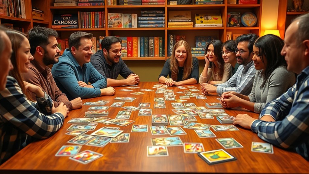 If you’re looking for strategy card games suitable for large groups, I recommend games like The Resistance, Secret Hitler, or Coup. These games encourage social deduction and teamwork, making them perfect for big gatherings. I love how they keep everyone engaged and spark lively conversations. They’re easy to learn, quick to set up, and guarantee everyone stays involved, making your game night more dynamic and fun for all.
