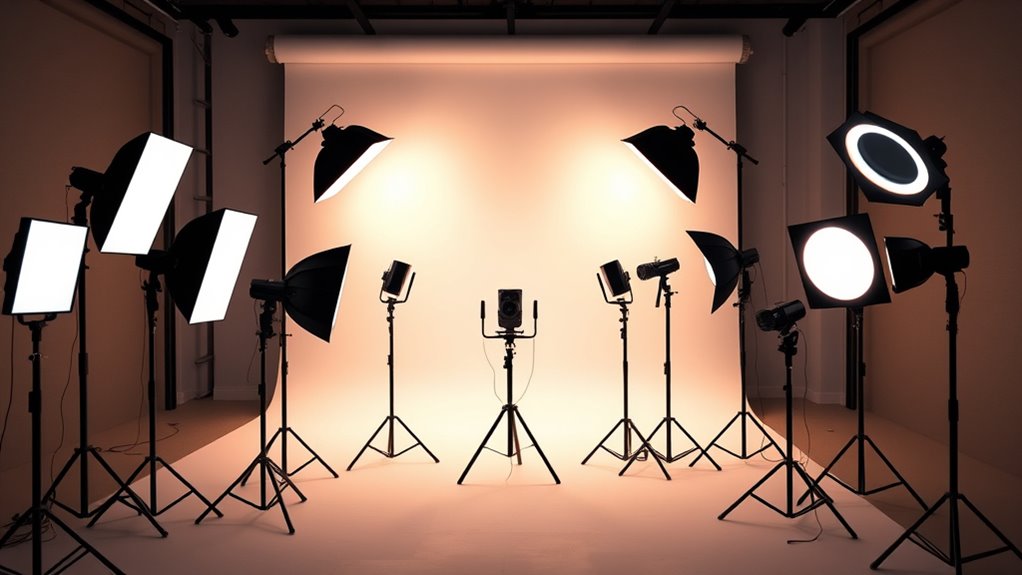 If you’re looking for the 7 best studio lighting kits for flawless photos in 2026, I recommend options that combine professional quality, versatility, and value. From softbox kits with adjustable stands and backdrops to RGB LED lights with app control, these choices cover all your needs. I’ll guide you through the top picks that balance affordability and performance, so you can find the perfect setup. Keep going to discover more about each option.