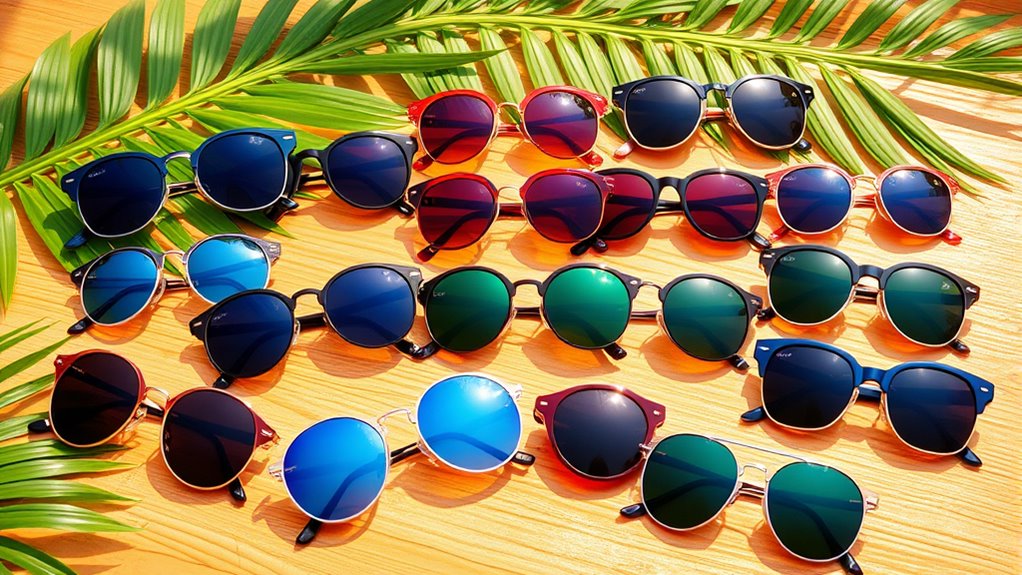 Choosing the right frame material for your sunglasses can make a significant difference in their durability and overall performance. I always look for durable materials like polycarbonate, TR90, or stainless steel because they resist impacts, scratches, and breakage, ensuring my sunglasses last longer. High-quality plastics like acetate and reinforced metal hinges also boost durability, which I find essential. Impact-resistant materials protect against cracks and deformation from accidental drops—trust me, it happens! I appreciate lightweight yet sturdy options that don’t compromise comfort. Plus, corrosion-resistant metals and reinforced plastics help my sunglasses endure various environmental conditions. By prioritizing these materials, I know I’m making a smart choice for both protection and style.