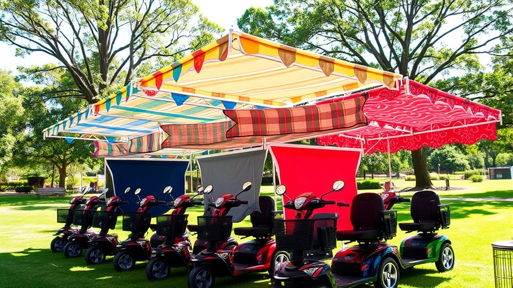 As a mobility scooter user, I’ve found that the right sunshade canopy can make a huge difference in staying cool and protected outdoors. These canopies come in various sizes, colors, and designs, with features like adjustable height and tool-free installation. Plus, many options support added accessories for extra convenience. If you’re looking for the best options to enhance your outdoor experience, you’ll discover some fantastic choices ahead that really cater to your needs.